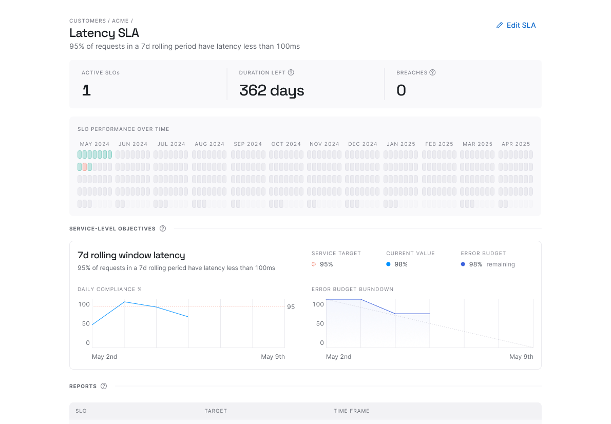 SLO performance over time chart: We've also introduced an aggregated SLO performance chart that displays your SLO performance over the entire SLA lifecycle. It helps you track long-term trends and assess overall compliance with your service agreements.