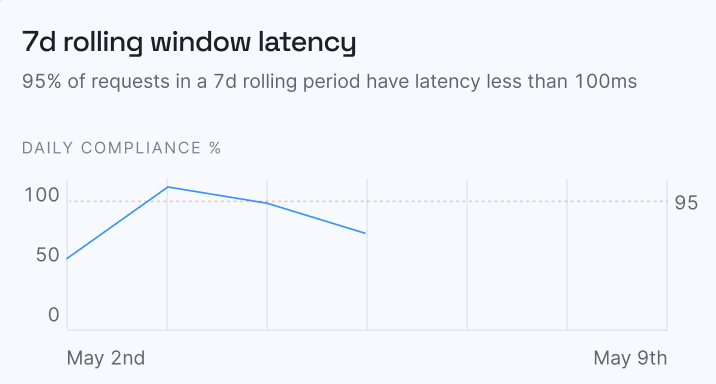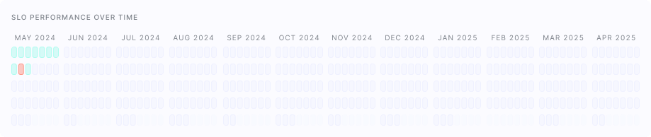 Daily compliance data for SLOs is aggregated across all active SLOs within an SLA to generate this chart. This means that if even one SLO breaches its daily target, its impact on the overall health of your service level will be clearly visible.