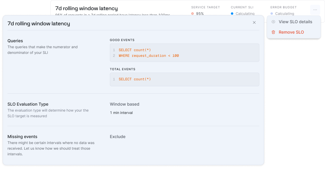 Error Budgets: We've introduced the concept of error budgets in SLO computation. Error budgets represent the acceptable level of service degradation over a given period, allowing teams to measure and manage the balance between innovation and reliability. With this update, you can now define and track error budgets directly within your SLOs, helping you make informed decisions about when to prioritize stability versus when to push new features or changes.