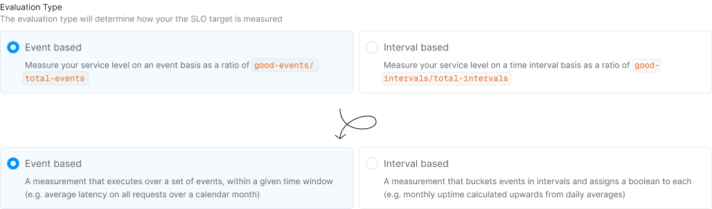 Added clarity on SLO evaluation types: Instead of telling users the formula of different SLO evaluation types (which we understand ended up creating more confusion), we have updated these cards to describe how the two evaluation types behave